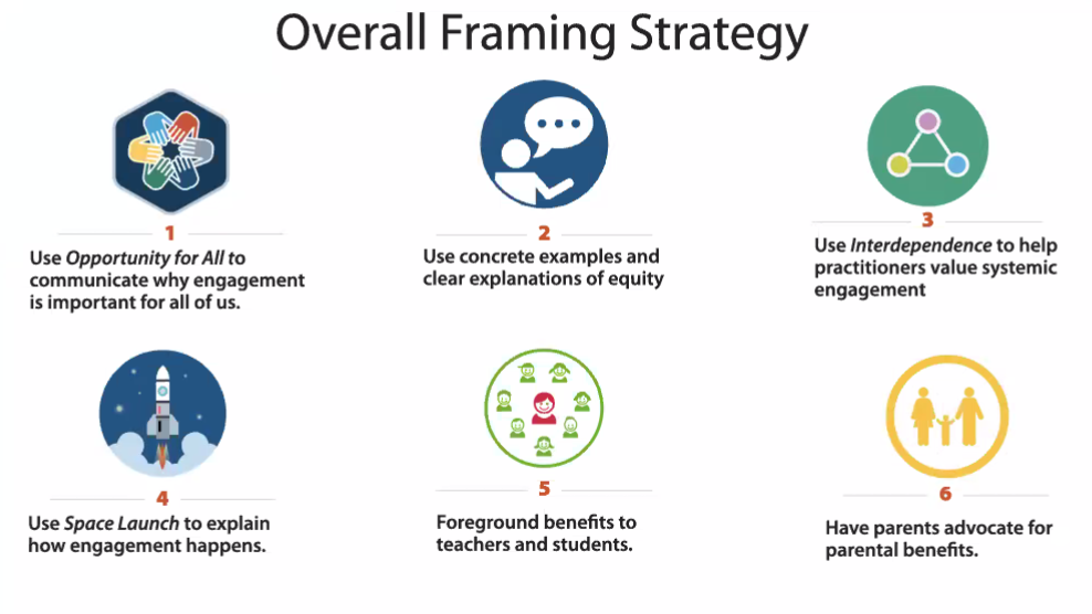 The National Association for Family, School, and Community Engagement (NAFSCE), partnered with the FrameWorks Institute to do groundbreaking research on how the public thinks about family engagement. They created a toolkit to help those working in schools and other organizations to reframe their communications. At the heart of this work are some key recommendations, which can be seen in the graphic below.